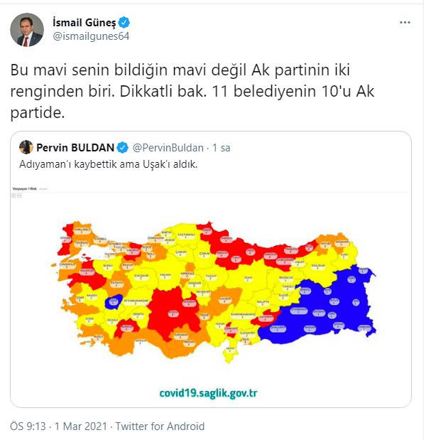 Buldan'ın paylaşımını alıntılayan AKP Uşak Milletvekili İsmail Güneş, ''Bu mavi senin bildiğin mavi değil Ak partinin iki renginden biri. Dikkatli bak. 11 belediyenin 10'u Ak partide'' paylaşımını yaptı.