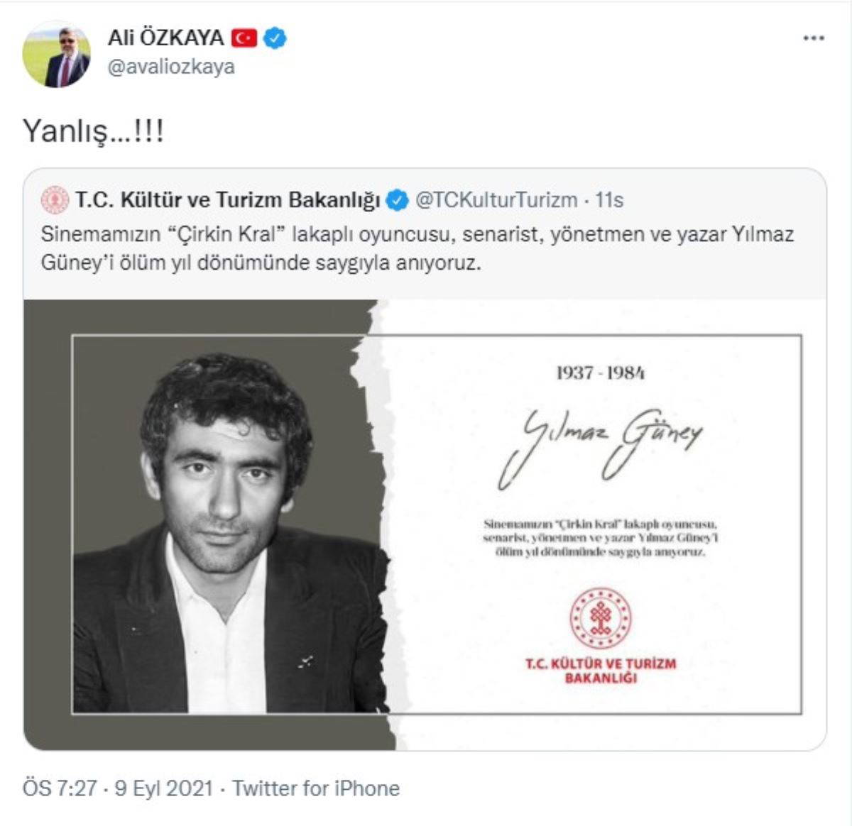 Bakanlık tarafından yapılan paylaşımda, “Sinemamızın ‘Çirkin Kral’ lakaplı oyuncusu, senarist, yönetmen ve yazar Yılmaz Güney’i ölüm yıl dönümünde saygıyla anıyoruz” ifadelerine yer verdi.