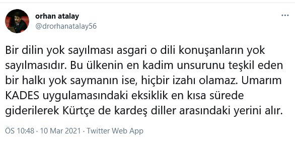 AKP'li milletvekili Orhan Atalay da konuya ilişkin yaptığı açıklamada İçişleri Bakanı Süleyman Soylu'yu eleştirdi. Atalay, "Bir dilin yok sayılması asgari o dili konuşanların yok sayılmasıdır. Bu ülkenin en kadim unsurunu teşkil eden bir halkı yok saymanın ise, hiçbir izahı olamaz. Umarım KADES uygulamasındaki eksiklik en kısa sürede giderilerek Kürtçe de kardeş diller arasındaki yerini alır” ifadelerini kullandı.