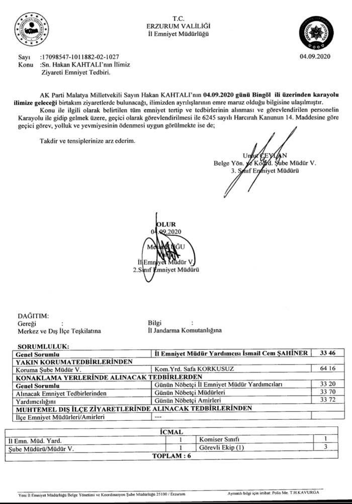 Malatya Milletvekili Hakan Kahtalı'nın Erzurum'un ilçeleri arasındaki ziyareti için eskortlu ayrı ekip oluşturulması da istendi. Polislere geçici görev yolluk ve yevmiyesinin ödenmesi uygun görüldü.