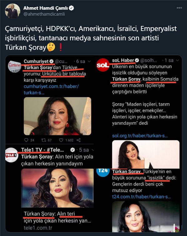 Twitter hesabından yaptığı paylaşımda Türkan Şoray'ın sözlerinin yer aldığı haber görsellerine yer veren Çamcı "Çamuriyetçi, HDPKK'cı, Amerikancı, İsrailci, Emperyalist işbirlikçisi, tantanacı medya sahnesinin son artisti Türkan Şoray" ifadelerini kullanmıştı.