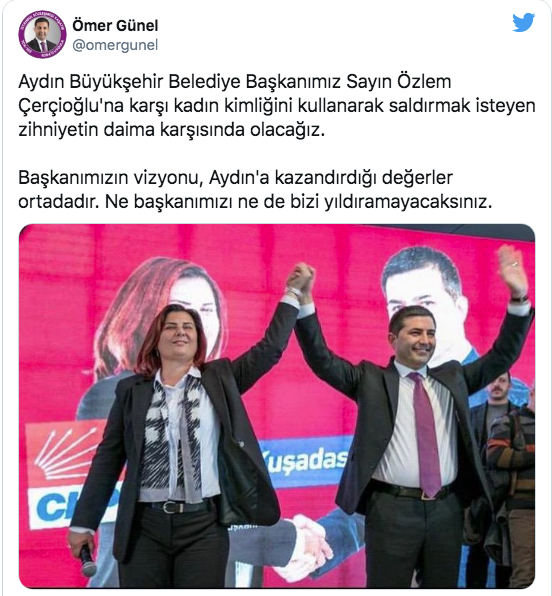 Kuşadası Belediye Başkanı Ömer Günel de AKP'li Yavuz'a tepki göstererek, "Aydın Büyükşehir Belediye Başkanımız Sayın Özlem Çerçioğlu'na karşı kadın kimliğini kullanarak saldırmak isteyen zihniyetin daima karşısında olacağız. Başkanımızın vizyonu, Aydın'a kazandırdığı değerler ortadadır. Ne başkanımızı ne de bizi yıldıramayacaksınız" dedi.