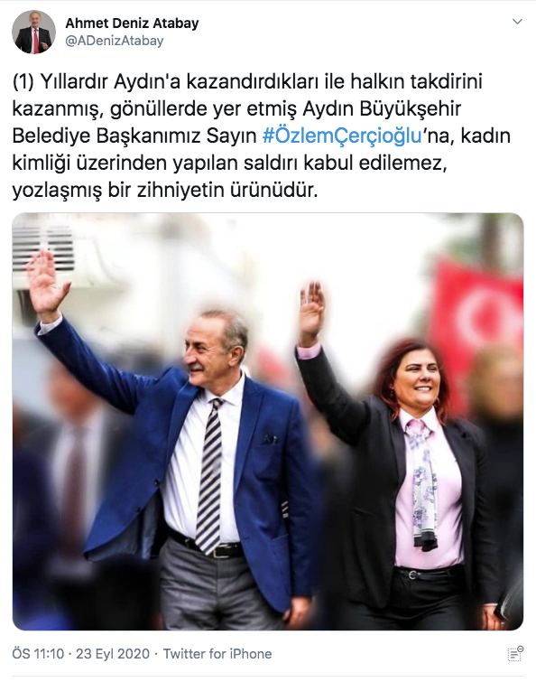 Metin Yavuz’un skandal sözlerine bir tepkide Didim Belediye Başkanı A.Deniz Atabay’dan geldi. Sosyal medya hesabından Aydın Büyükşehir Belediye Başkanı Özlem Çerçioğlu ile birlikte fotoğrafını paylaşarak açıklamalarda bulunan Didim Belediye Başkanı A.Deniz Atabay, “Yıllardır Aydın'a kazandırdıkları ile halkın takdirini kazanmış, gönüllerde yer etmiş Aydın Büyükşehir Belediye Başkanımız Sayın Özlem Çerçioğlu'na, kadın kimliği üzerinden yapılan saldırı kabul edilemez, yozlaşmış bir zihniyetin ürünüdür. Yerelden genele iktidar yolunda emin adımlarla ilerlediğimiz bir dönemde, bizlere ve Aydın Büyükşehir Belediye Başkanımıza yapılan bu saldırılara boyun eğmeyeceğiz, Aydın için, Didim için birlikte çalışacak, Birlikte Başaracağız!” ifadelerini kullandı.