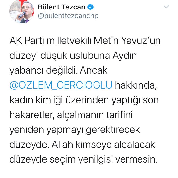 “AK Parti milletvekili Metin Yavuz’un düzeyi düşük üslubuna Aydın yabancı değildi. Ancak @OZLEM_CERCIOGLU hakkında, kadın kimliği üzerinden yaptığı son hakaretler, alçalmanın tarifini yeniden yapmayı gerektirecek düzeyde. Allah kimseye alçalacak düzeyde seçim yenilgisi vermesin”