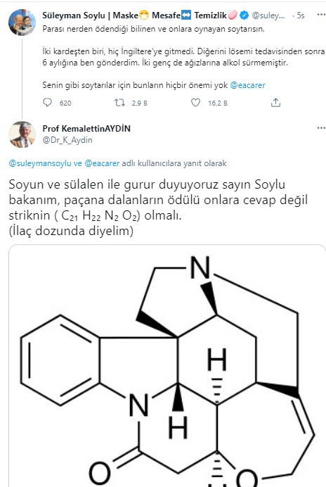 AKP'nin Siyasi Erdem ve Etik Kurulu Başkanı Prof. Dr. Kemalettin Aydın, Soylu'ya zehir önerdi. Erkek Acarer'e verilen yanıtın altına yorum yapan AKP'li Aydın, "Soyun ve sülalen ile gurur duyuyoruz sayın Soylu bakanım; paçana dalanların ödülü onlara cevap değil striknin (C²0 H²² N² O²) olmalı" diyerek zehir önerdi.