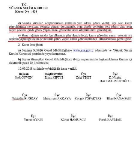 İlk karar 2018 seçimlerinin öncesinde, Samsun Atakum İlçe Seçim Kurulu'nun görüş sorması üzerine YSK tarafından 10.05.2018'de verilmiştir. Karar ‘Sandık kurullarının öncelikle yerleşim yeri adresi görev yaptığı ilçe ile aynı olan kamu görevlilerinden oluşturulması gerektiğine Sandık kurulları oluşturulurken yerleşim yeri adresi görev yaptığı ilçe olan kamu görevlilerinin sayısının yetersiz olması durumunda, aynı ilçede yerleşim yeri adresi olan aynı seçim çevresi içinde görev yapan kamu görevlilerinden oluşturulması gerektiğine, buna rağmen sandık kurullarında görevlendirilecek kamu görevlisi sayısı yetersiz ise seçimin yapıldığı seçim çevresinde görev yapan kamu görevlilerinden oluşturulması gerektiğine’ hükmetmiştir.
