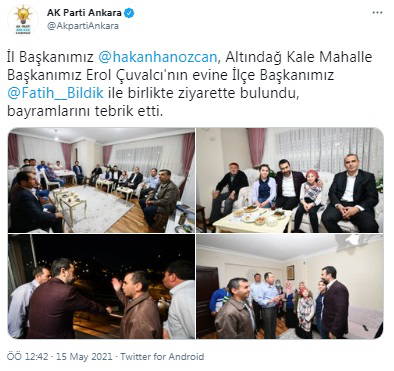 Ziyaretin fotoğrafları ayrıca teşkılatın Twitter hesabından da paylaşıldı. Paylaşımda, "İl Başkanımız Hakanhan Özcan, Altındağ Kale Mahalle Başkanımız Erol Çuvalcı'nın evine İlçe Başkanımız Fatih Bildik ile birlikte ziyarette bulundu, bayramlarını tebrik etti" denildi.