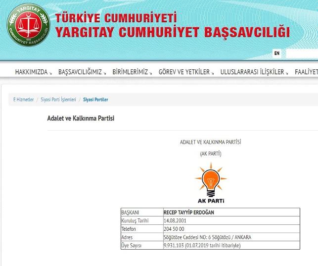2018 Ağustos ayında 6. Olağan Kongresi sürecinde AKP’de güncellenen üye sayısı 10 milyon 719 bin 234 olarak açıklanmıştı. Yargıtay Cumhuriyet Başsavcılığı’nın sitesinde yer alan Temmuz 2019 tarihli son verilerde ise AKP’nin üye sayısı 9 milyon 931 bin 103 olarak belirtildi.