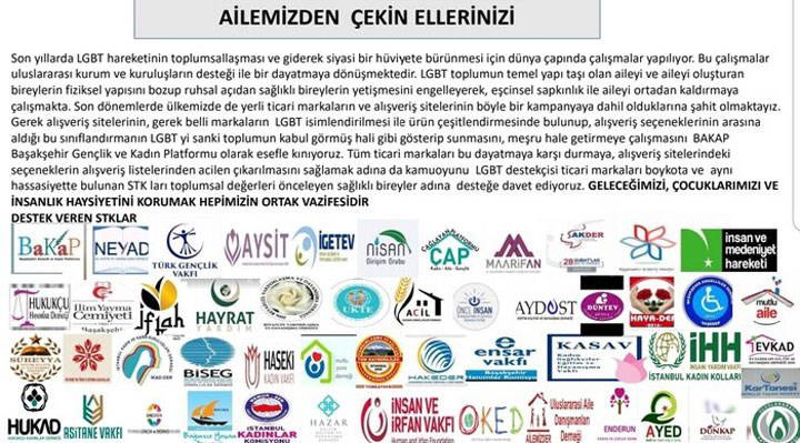 "Yerli ticari markaların ve alışveriş sitelerinin böyle bir kampanyaya dahil olduklarına şahit olmaktayız. Gerek alışveriş sitelerinin, gerek belli markaların LGBT isimlendirmesi ile ürün çeşitlendirmesinde bulunup, alışveriş seçeneklerinin arasına aldığı bu sınıflandırmanın LGBT'yi sanki toplumun kabul görmüş hali gibi gösterip sunmasını, meşru hale getirmeye çalışmasını esefle kınıyoruz.