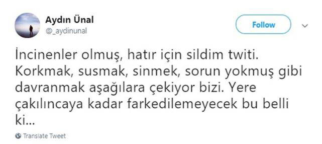 Ünal daha sonra bu tweetini silerek, “İncinenler olmuş, hatır için sildim twiti. Korkmak, susmak, sinmek, sorun yokmuş gibi davranmak aşağılara çekiyor bizi. Yere çakılıncaya kadar fark edilemeyecek bu belli ki...” diye yazdı.
