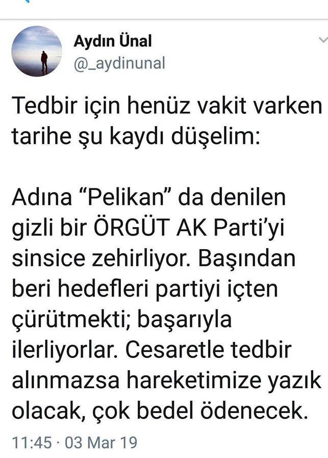 Aydın Ünal’ın “Adına ‘Pelikan’ da denilen gizli bir örgüt Ak Parti’yi sinsice zehirliyor” demesi ise eski Başbakan Ahmet Davutoğlu’nun görevden el çektirilmesi sürecini başlatan “Pelikan Bildirisini” akıllara getirdi.