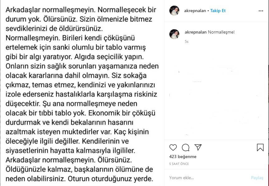 "Arkadaşlar normalleşmeyin. Normalleşecek bir durum yok. Ölürsünüz. Sizin ölmenizle bitmez sevdiklerinizi de öldürürsünüz. Normalleşmeyin. Binleri kendi çöküşünü ertelemek için sanki olumlu bir tablo varmış gibi bir algı yaratıyor. Algıda seçicilik yapın. Onların sizin sağlık sorunları yaşamanıza neden olacak kararlarına dahil olmayın. Siz sokağa çıkmaz, temas etmez, kendinizi ve yakınlarınızı izole ederseniz hastalıklarla karşılaşma riskiniz düşecektir. Şu ana normalleşmeye neden olacak bir tıbbi tablo yok. Ekonomik bir çöküşü durdurmak ve kendi bekalarının hasarını azaltmak isteyen muktedirler var. Kaç kişinin öleceğiyle ilgili değiller. Kendilerinin ve siyasetlerinin hayatta kalmasıyla ilgililer. Arkadaşlar normalleşmeyin. Ölürsünüz. Öldüğünüzle kalmaz, başkalarının ölümüne de neden olabilirsiniz. Oturun oturduğunuz yerde."