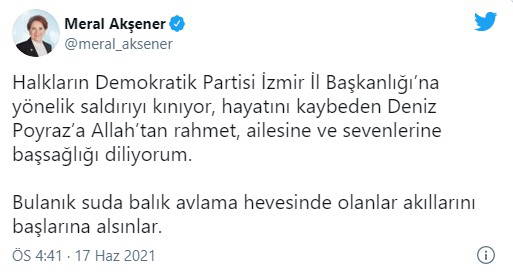 İYİ Parti Genel Başkanı Meral Akşener, HDP İzmir il binasına yapılan ve Deniz Poyraz isimli yurttaşın yaşamını yitirmesine neden olan saldırıya ilişkin sosyal medya hesabından açıklama yaptı.