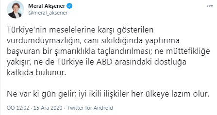 Akşener, sosyal medya hesabından yaptığı açıklamada "Türkiye'nin meselelerine karşı gösterilen vurdumduymazlığın, canı sıkıldığında yaptırıma başvuran bir şımarıklıkla taçlandırılması; ne müttefikliğe yakışır, ne de Türkiye ile ABD arasındaki dostluğa katkıda bulunur. Ne var ki gün gelir; iyi ikili ilişkiler her ülkeye lazım olur" ifadelerini kullandı.