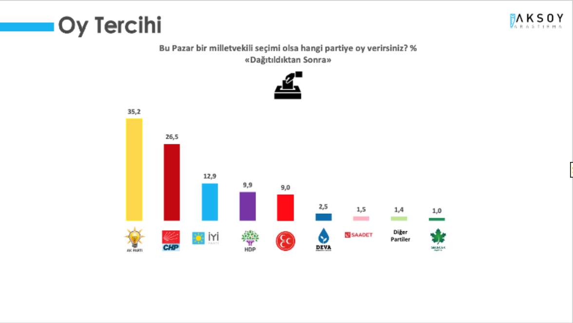 Araştırmanın sonuçlarına göre; “Bu pazar bir milletvekili seçimi olsa hangi partiye oy verirsiniz?” sorusuna katılımcıların yüzde 17,9’u kararsız olduğunu, belirtmek istemediğini ve oy kullanmayı düşünmediğini ifade etti. Araştırma sonuçlarında kararsızlar dağıtıldıktan sonra Cumhur İttifakı’nın oy oranı yüzde 44,2 olarak gerçekleşti. Millet İttifakı’nın oy oranı ise yüzde 39,4 seviyesinde görüldü. Her iki ittifakın dışında olan HDP’nin oy oranı ise yüzde 9,9 oldu. Geçen aya oranla Cumhur İttifakı’nın oy oranında 0,4 puanlık bir artış, Millet İttifakı’nın oy oranında ise 0,9 puanlık bir düşüş gözlemlendi. Kararsızlar dağıtıldıktan sonra partilerin oy oranı ise şöyle: