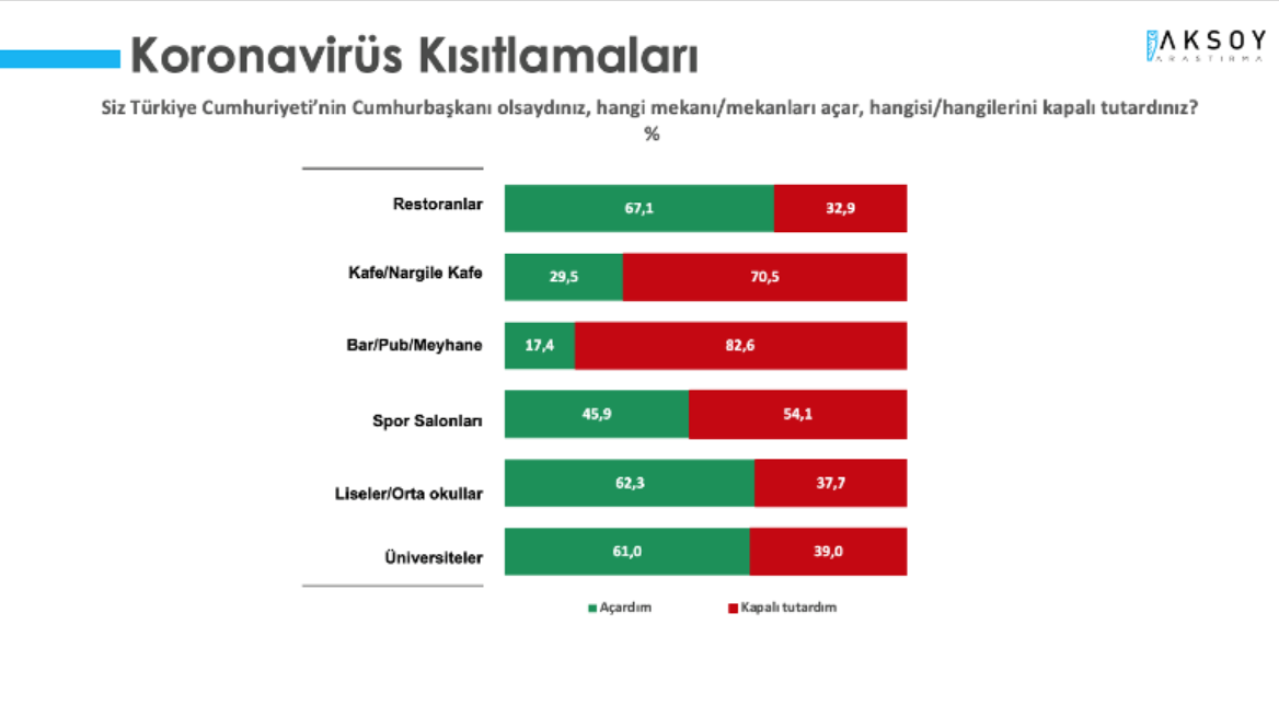 Bu başlık altında sorulan bir diğer soru ise katılımcıların Türkiye Cumhuriyeti’nin Cumhurbaşkanı olmaları durumunda hangi mekanları açıp hangilerini ise kapalı tutacaklarıydı. Restoranlarla ilgili katılımcıların görüşü %67,1 oranı ile açılması yönünde oldu. Açılmasına yönelik olumlu görüş bildirilen diğer mekânlar ise «Lise/Orta okullar» ve «Üniversiteler» idi. Araştırmaya katılanların %62,3’ü lise ve orta okulların, %61’i ise üniversitelerin açılması yönünde adım atacağını ifade etti. Spor salonlarıyla ilgili genel kanı ise %45,9 oranında açılması, %54,1 oranında ise kapalı kalması yönünde. Seçmenin tercihleri değerlendirildiğinde, yiyecek ve eğitim gibi temel ihtiyaçların sunulduğu mekânlara yönelik kısıtlamaların gevşetilmesine dair daha olumlu bir yaklaşımın oluştuğu dikkat çekmekte. Diğer mekânlara göre daha keyfi olarak kabul edilen «Kafe/Nargile Kafe» ve «Bar/Pub/Meyhane» tarzı mekânlara yönelik ise daha olumsuz bir yaklaşım öne çıkmakta.