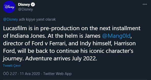 BBC'nin haberine göre, Disney'den yapılan açıklamada 78 yaşındaki usta oyuncunun Ford'un, James Mangold’un yöneteceği filmde "Indiana Jones" karakterini beşinci kez canlandıracağı açıklandı.