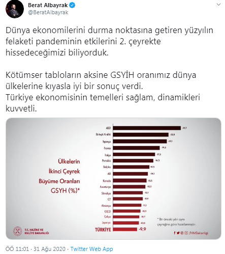Albayrak, grafiğin sonunda yer alan Türkiye ekonomisi için "Kötümser tabloların aksine GSYİH oranımız dünya ülkelerine kıyasla iyi bir sonuç verdi.Türkiye ekonomisinin temelleri sağlam, dinamikleri kuvvetli" değerlendirmesinde bulundu.