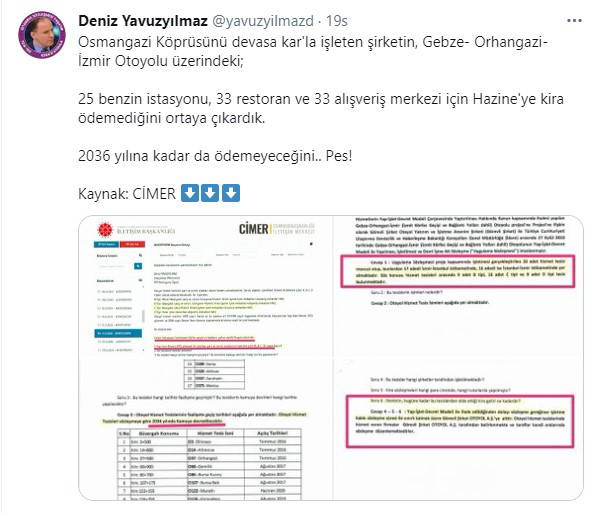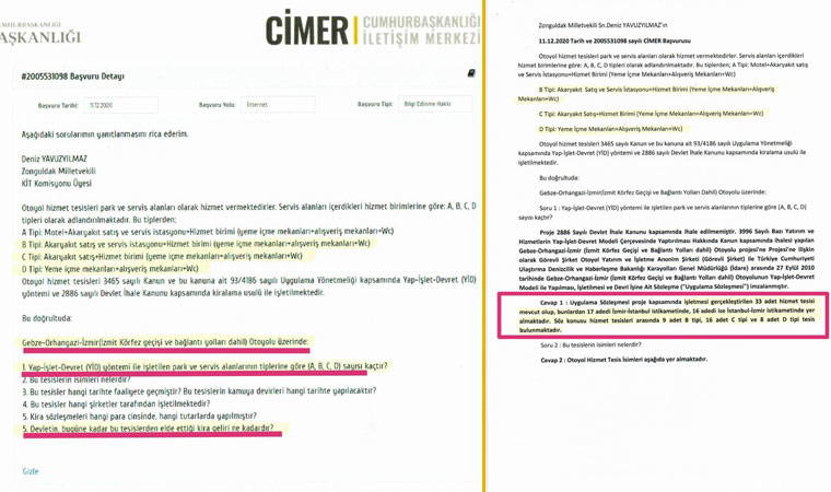 CHP Zonguldak Milletvekili ve KİT Komisyonu Üyesi Deniz Yavuzyılmaz, Gebze-Orhangazi-İzmir Otoyolu üzerindeki faaliyet gösteren işletmelerin, hangi şirketler tarafından ne şekilde çalıştırıldığına dair, yanıtlanması için Cumhurbaşkanlığı İletişim Merkezi’ne (CİMER) İletişim Başkanlığı’na yazılı başvuruda bulundu.