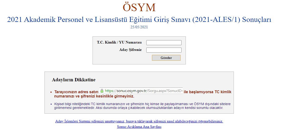 Kurum diğer sınavlarda da olduğu gibi Akademik Personel ve Lisansüstü Eğitimi Giriş Sınavı sonuçlarını https://sonuc.osym.gov.tr/ adresinden açıkladı. Sınava katılan adaylar TC kimlik numaraları ve şifreleri ile sisteme giriş yaptıkları takdirde sonuçlarını görebilecekler.