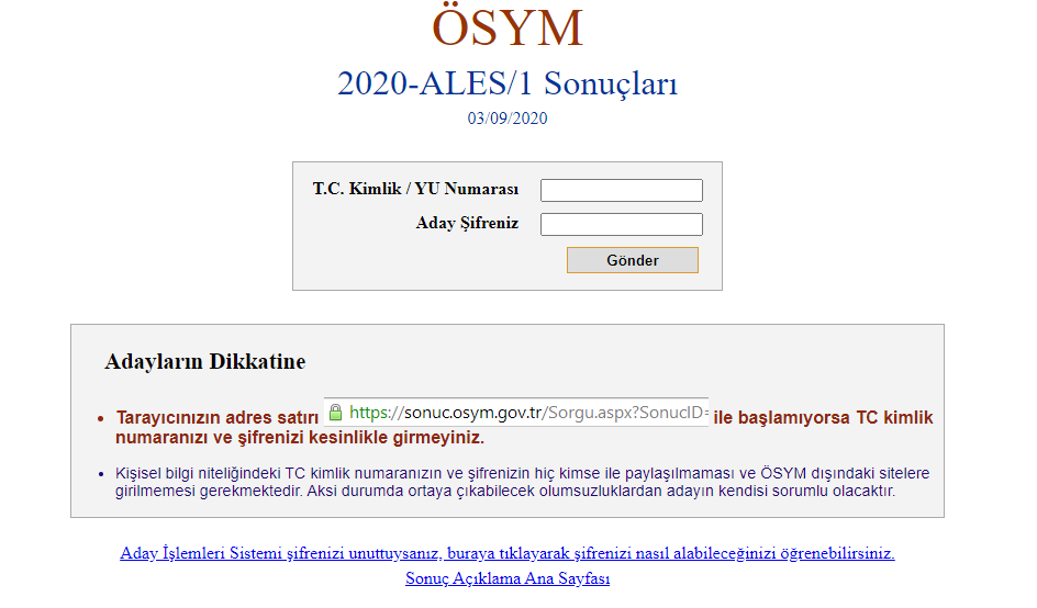 Adaylar, sınav sonuçlarına 3 Eylül 2020 tarihinde saat 10.00'dan itibaren ÖSYM'nin https://sonuc.osym.gov.tr/ internet adresinden T.C Kimlik numaraları ve aday şifreleri ile erişebilirler" denildi.