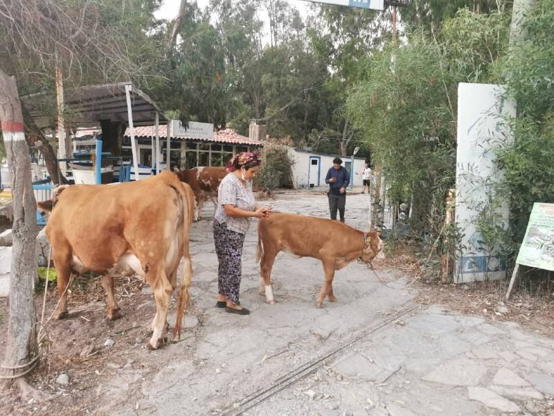 Tamamen alevlere teslim olan köyde yaşayan yurttaşlar, yangından kurtardıkları inekleri ile birlikte sahile inip kumsalda beklemeye başladı.