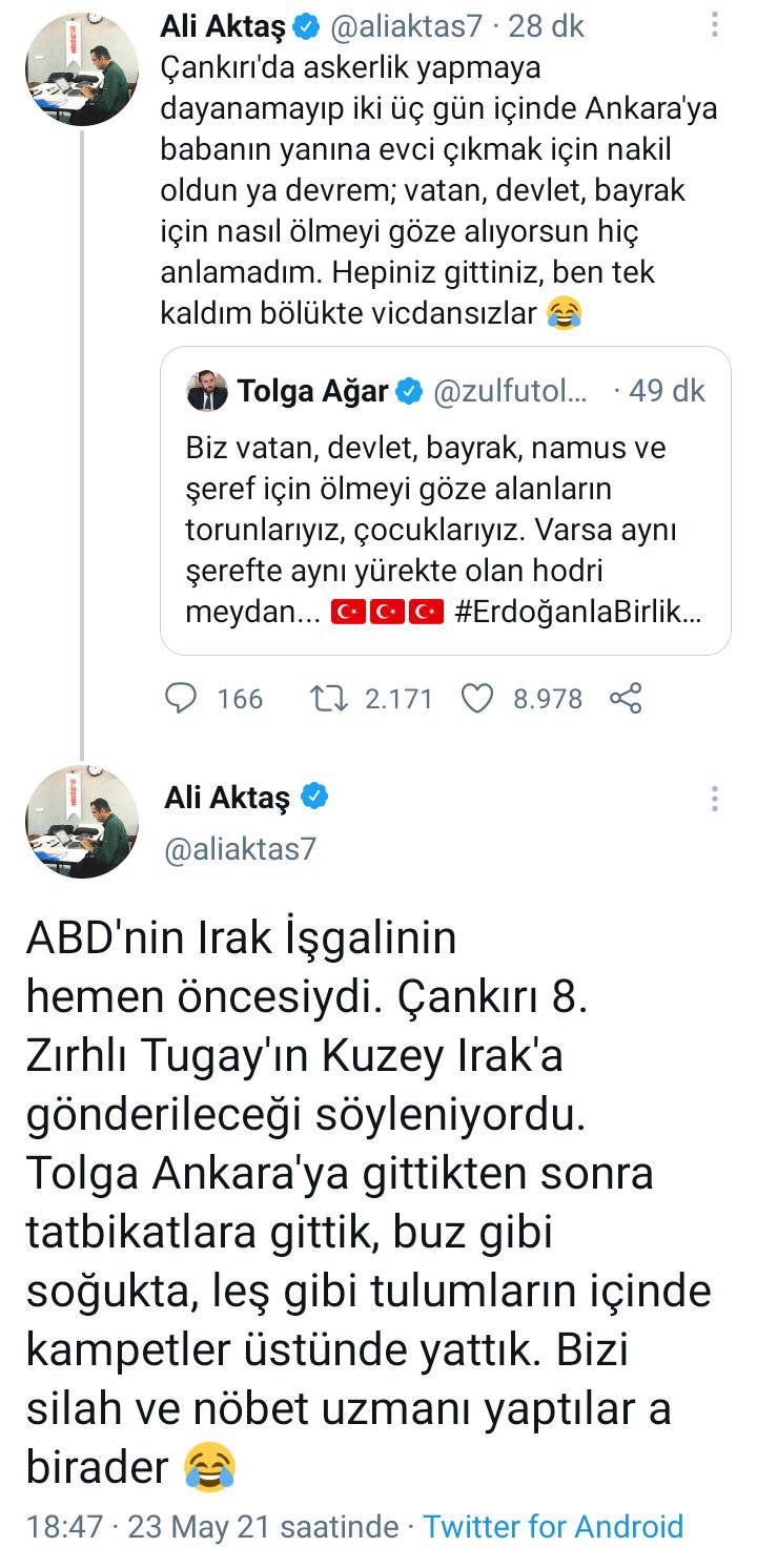 Ağar’ın paylaşımına tepki gösteren Aktaş, ''Çankırı'da askerlik yapmaya dayanamayıp iki üç gün içinde Ankara'ya babanın yanına evci çıkmak için nakil oldun ya devrem; vatan, devlet, bayrak için nasıl ölmeyi göze alıyorsun hiç anlamadım” dedi.