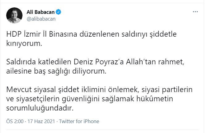 "HDP İzmir il binasına düzenlenen saldırıyı şiddetle kınıyorum. Saldırıda katledilen Deniz Poyraz’a Allah’tan rahmet, ailesine baş sağlığı diliyorum. Mevcut siyasal şiddet iklimini önlemek, siyasi partilerin ve siyasetçilerin güvenliğini sağlamak hükûmetin sorumluluğundadır."