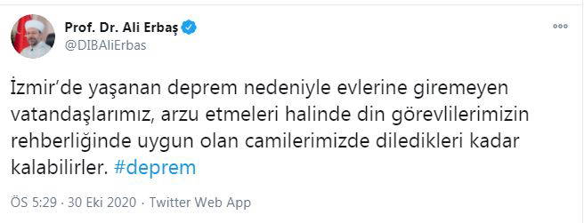 Diyanet İşleri Başkanı Erbaş, İzmir'deki 6.6 büyüklüğündeki depreme ilişkin Twitter hesabından açıklamada bulunarak, "İzmir’de yaşanan deprem nedeniyle evlerine giremeyen vatandaşlarımız, arzu etmeleri halinde din görevlilerimizin rehberliğinde uygun olan camilerimizde diledikleri kadar kalabilirler" ifadelerini kullandı.