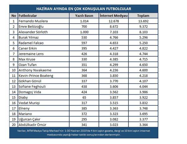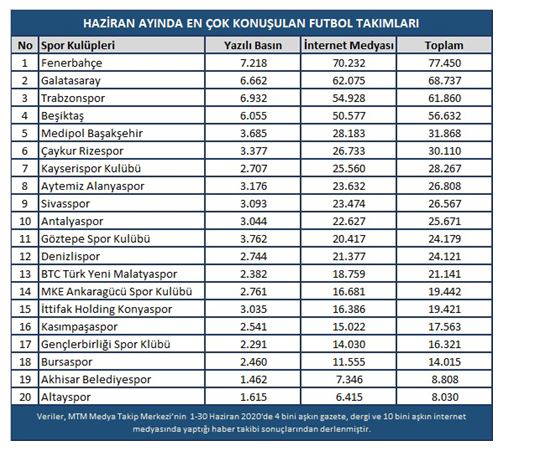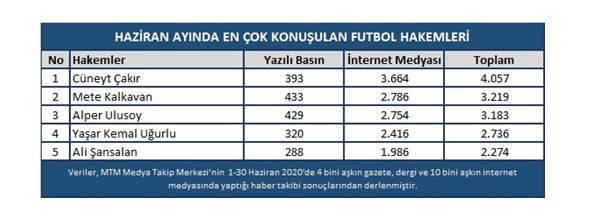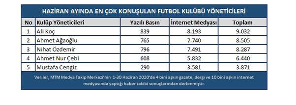 Haziran ayında toplam 9 bin 32 haberde yer alan Ali Koç en çok konuşulan yönetici oldu. Koç’u sırası ile 8 bin 505 haber ile Ahmet Ağaoğlu ve 8 bin 287 haber ile Nihat Özdemir takip etti.Süper Lig'in 29. haftasında Çaykur Rizespor ile Yukatel Denizlispor 2-2 berabere kaldı. Maç sonu konuşan Denizlispor Teknik Direktörü Bülent Uygun, maçın hakemi Cüneyt Çakır'ın kırmızı kartını kendisine hediye ettiğini belirterek, "Bugün 200. maçım olması nedeniyle kartı hediye etti. Anı olarak kalacak. Türkiye'nin yetiştirdiği çok değerli bir hakem, kendisine teşekkür ediyorum." şeklinde konuştu. MTM’nin raporuna göre tecrübeli hakem Cüneyt Çakır Haziran ayı boyunca toplam 4 bin 57 haber ile medyada en fazla yer bulan süper lig hakemi oldu. Çakır’ı sırası ile 3 bin 219 haber ile Mete Kalkavan ve 3 bin 183 haber ile Alper Ulusoy takip etti.