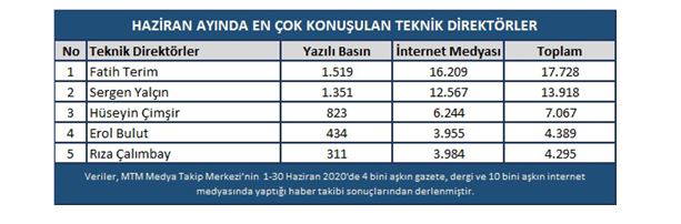 Fatih Terim, Medya Takip Merkezi’nin aynı raporuna göre toplam 21 bin 105 haberde yer alarak en fazla konuşulan antrenör olma unvanını Haziran ayında da kimseye bırakmadı. Terim’i sırası ile 19 bin 198 haberle siyah-beyazlı takımın çalıştırıcısı Sergen Yalçın ve 17 bin 770 haber ile sarı-lacivertli takımın çalıştırıcısı Ersun Yanal takip etti.
