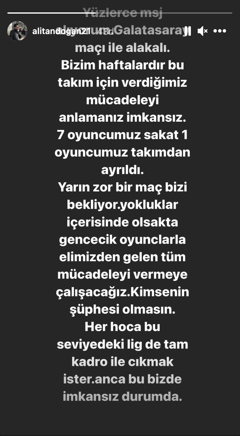 "Galatasaray maçıyla alakalı yüzlerce mesaj alıyorum. Bizim haftalardır bu takım için verdiğimiz mücadeleyi anlamanız imkânsız. Galatasaray maçında yokluklar içerisinde olsak da, gencecik oyuncularla elimizden gelenin en iyisini yapmaya çalışacağız. Kimsenin şüphesi olmasın. Her hoca bu seviyedeki ligde tam kadro ile maça çıkmak ister ancak bu bizim için imkânsız durumda."