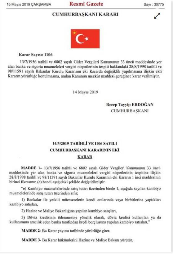 Resmi Gazete'nin dünkü sayısında yayımlanan Cumhurbaşkanlığı kararına göre, kambiyo muamelelerinde (döviz alım satımı) binde 1 vergi alınacağı belirtildi. Bu karar kamuoyunda sadece döviz satarken binde 1 oranında Banka ve Sigorta Muameleleri Vergisi (BSMV) alınacağı şeklinde algılandı. Kararda satış tutarı üzerinden vergi alınacağının yazılması bu düşünceye neden oldu. Oysa kararda 'satış tutarından' önceki kelime kelime 'muameleleri' olarak geçiyor. Muamele ise ham alım hem satımı içeriyor. Karardaki tam cümle şöyle: " Kambiyo muamelelerinde satış tutarı üzerinden binde 1." Nitekim edinilen bilgilere göre uygulamada da hem alım hem satımda vergi alınacak.