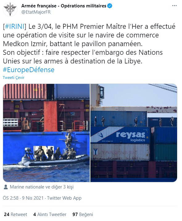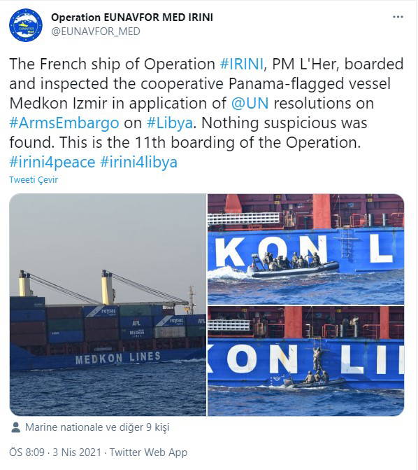 Fransız İrini Operasyon Gemisi PM L'Her, Panama bayraklı MEDKON İzmir adlı Türk şirketine ait gemide arama gerçekleştirdi. Libya açıklarında gerçekleştirilen aramada şüpheli bir şeyin bulunmadığı belirtildi.