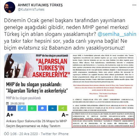 Kutalmış Türkeş, MHP'ye yönelik bir "slogan yasağı" iddiasını da dile getirerek "Dönemin Ocak genel başkanı tarafından yayınlanan genelge aşağıdaki gibidir, neden MHP genel merkezi Türkeş için atılan sloganı yasaklamıştır? @semiha__sahin ya takır takır hepsini sor, yada canlı yayına bağla! Ne biçim evlatsınız siz Babanızın adını yasaklıyorsunuz!" dedi.