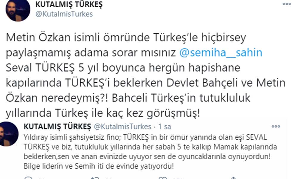 "Metin Özkan isimli ömründe Türkeş’le hiçbir şey paylaşmamış adama sorar mısınız Seval Türkeş 5 yıl boyunca her gün hapishane kapılarında Alparslan Türkeş’i beklerken Devlet Bahçeli ve Metin Özkan neredeymiş?! Bahçeli Türkeş’in tutukluluk yıllarında Türkeş ile kaç kez görüşmüş!”