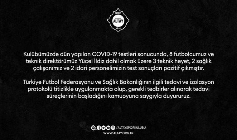 Altay Spor Kulübü, dün yapılan koronavirüs testleri sonucunda 8 futbolcu ve Teknik Direktör Yücel İldiz dahil olmak üzere 3 teknik heyet, 2 sağlık çalışanı ve 2 idari personelde test sonuçlarının pozitif olarak çıktığını açıkladı. Siyah-beyazlı kulüp, Türkiye Futbol Federasyonu ve Sağlık Bakanlığı'nın ilgili tedavi ve izolasyon protokolünün titizlikle uygulandığını ve gerekli tedbirler alınarak tedavi süreçlerinin başlatıldığını duyurdu.