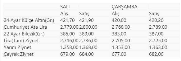 İstanbul Kapalıçarşı'da alınıp satılan altın türlerinin, önceki kapanış ve bugün açılış fiyatları (TL) şöyle: