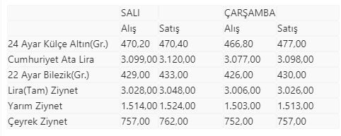 İstanbul Kapalıçarşı'da alınıp satılan altın türlerinin, önceki kapanış ve bugün açılış fiyatları (TL) şöyle: