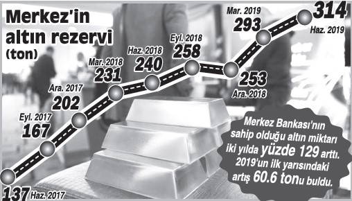 Dünya Altın Konseyi verilerine göre, 2019’un ilk altı ayında dünyada merkez bankalarının toplam altın alımı 15.7 milyar dolar bedelle 374.1 ton olurken, bunun yüzde 16.2’sine denk gelen 60.6 tonluk bölümünü yaklaşık 2.5 milyar dolarlık bedelle tek başına TCMB yaptı. Şubatta 31.5 tonluk alımla TCMB, dünyada söz konusu ayda ilk sırada yer aldı.