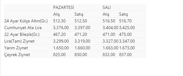 İstanbul Kapalıçarşı'da alınıp satılan altın türlerinin, önceki kapanış ve bugün açılış fiyatları (TL) şöyle: