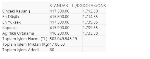 KMKTP'de, altında gerçekleşen toplam işlem hacmi 503 milyon 49 bin 548,29 lira, işlem miktarı ise 1.188,63 kilogram oldu.