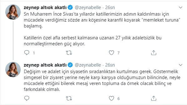 İnce'yi işaret ederek, "Katillerin özel afla serbest kalmasına uzanan 27 yıllık adaletsizlik bu normalleştirmeden güç alıyor" diyen Altıok, "Sayın Muharrem İnce, Sivas’ta yıllardır katillerimizin adının kaldırılması için mücadele verdiğimiz 'sözde anı köşesi'ne karanfil koyarak 'memleket turuna' başlamış" dedi.