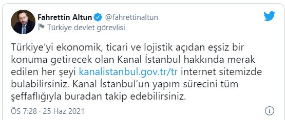 Altun, Twitter hesabından yaptığı açıklamada, "Türkiye'yi ekonomik, ticari ve lojistik açıdan eşsiz bir konuma getirecek olan Kanal İstanbul hakkında merak edilen her şeyi internet sitemizde bulabilirsiniz. Kanal İstanbul'un yapım sürecini tüm şeffaflığıyla buradan takip edebilirsiniz" dedi.