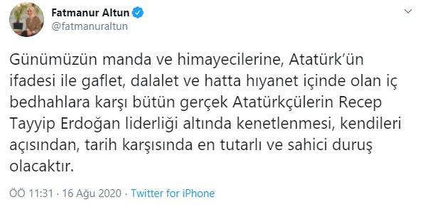 Biden'in sözlerini içeren görüntülerin AKP'ye yakın medya ve sosyal medya hesapları tarafından dolaşıma sokulmasının ardından muhalefetten Biden'a art arda tepkiler gelmesine rağmen Twitter hesabından "Biden’ın ifşa ettiği içimizdeki mandacılara sahiden tek söz söylemeyecek misiniz? Ülkenizle ilgili ufkunuz bu mu?! Gözünüz mü bağlı, gönlünüz mü?!" diye yazan Altun, Atatürkçüleri Recep Tayyip Erdoğan liderliği altında "kenetlenmeye" çağırdı.