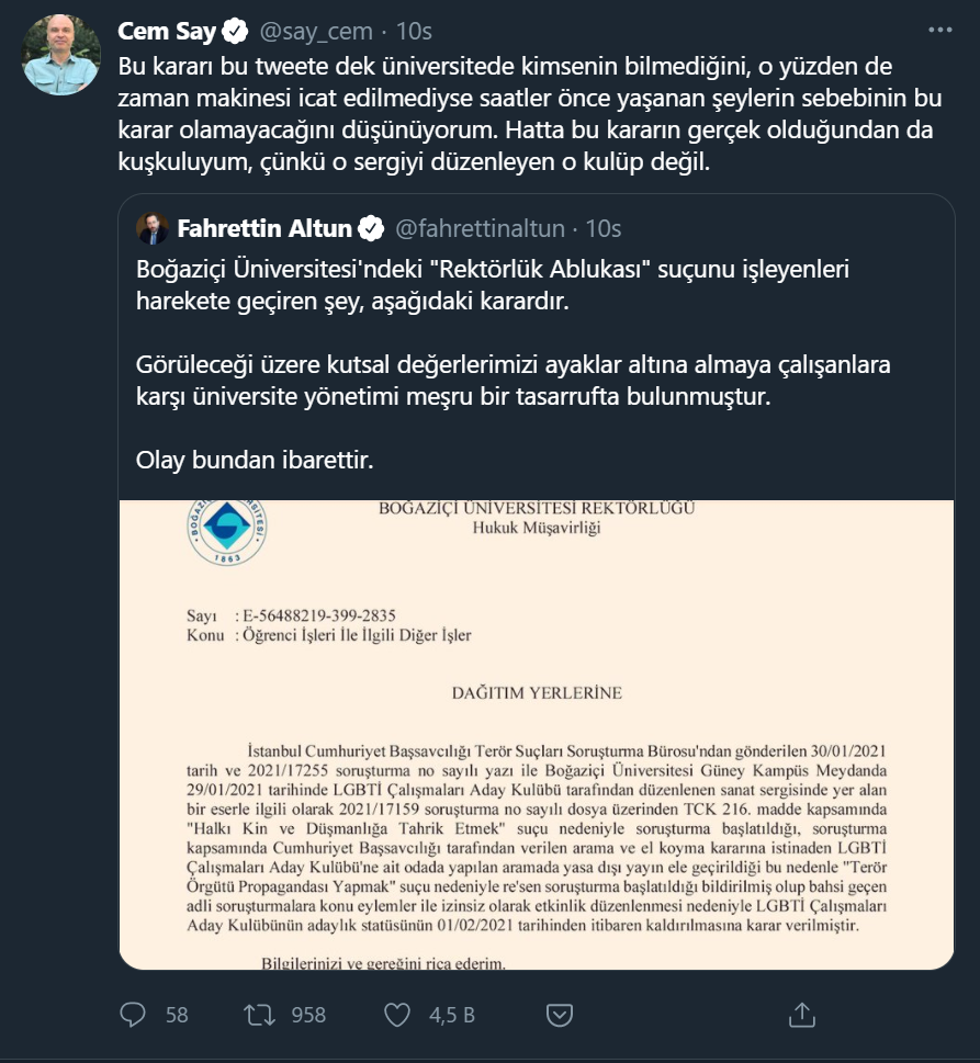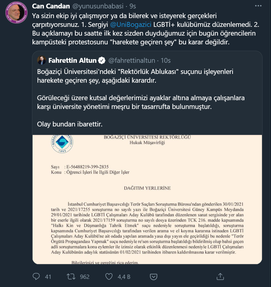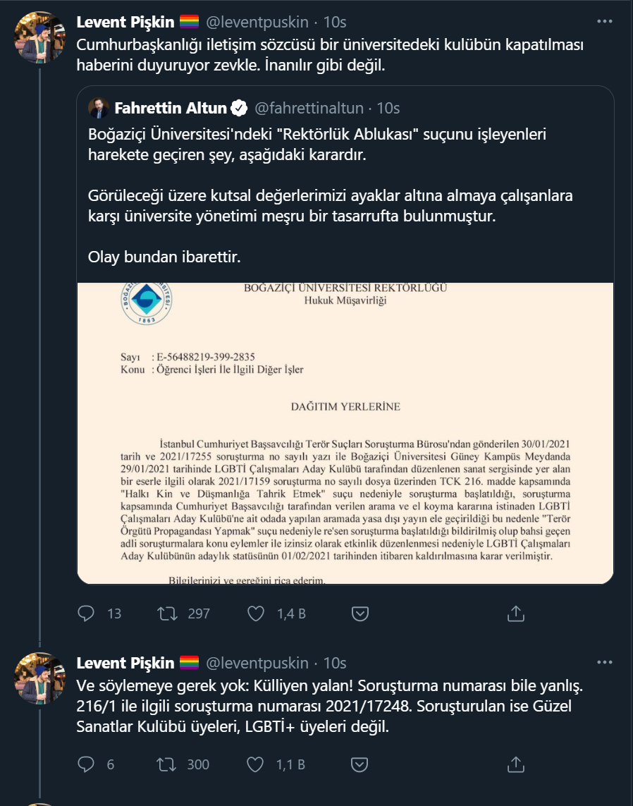 "Cumhurbaşkanlığı İletişim Sözcüsü bir üniversitedeki kulübün kapatılması haberini duyuruyor zevkle. İnanılır gibi değil. Ve söylemeye gerek yok: Külliyen yalan! Soruşturma numarası bile yanlış. 216/1 ile ilgili soruşturma numarası 2021/17248. Soruşturulan ise Güzel Sanatlar Kulübü üyeleri, LGBTİ+ üyeleri değil. Bugünkü eylem çağrısı ve abluka ile bağlantı ise yine yalan. Gözaltına alınan tek bir kulüp üyesi yok mesela. Ayıptır, günahtır, zulümdür, iftiradır!"