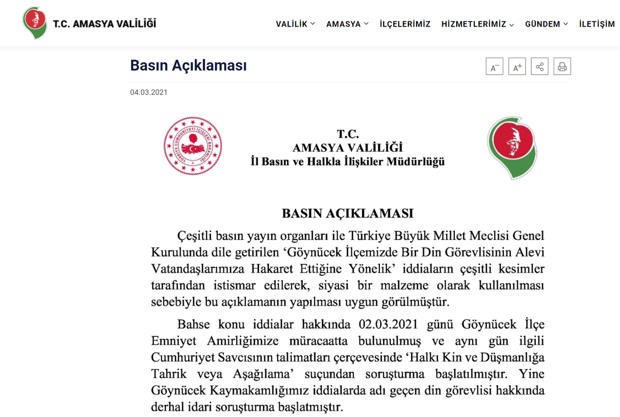 Valilikten yapılan yazılı açıklamada, "Çeşitli basın yayın organları ile Türkiye Büyük Millet Meclisi Genel Kurulunda dile getirilen 'Göynücek ilçemizde bir din görevlisinin Alevi vatandaşlarımıza hakaret ettiğine' yönelik iddiaların çeşitli kesimler tarafından istismar edilerek, siyasi bir malzeme olarak kullanılması sebebiyle bu açıklamanın yapılması uygun görülmüştür" ifadelerine yer verildi.