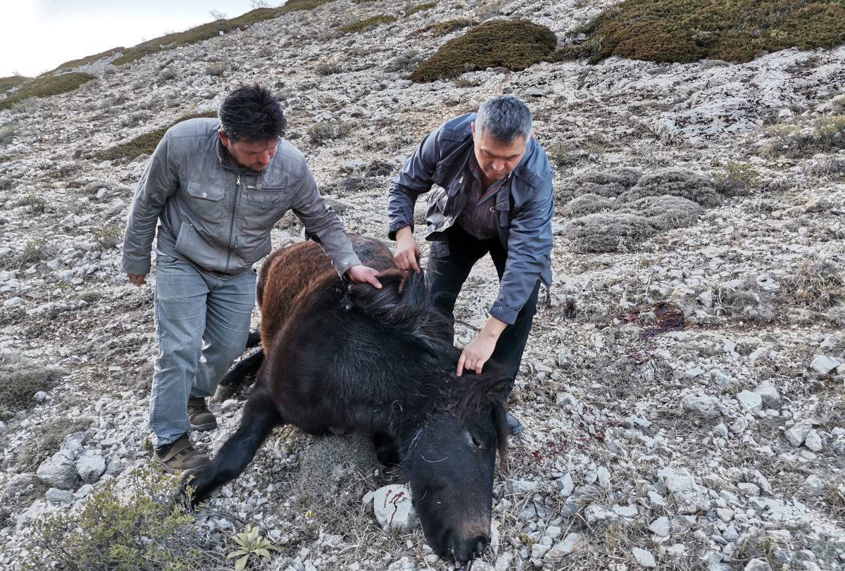 Koyun otlatırken yerde hareketsiz yatan atlarla karşılaşan Zeki Kuzucu, yaz-kış dağlarda yayılan yılkı atlarının vurulmasına tepki göstererek, “Kurşun atmışlar hayvanlara. İnsanlık dışı bir durum bu” dedi.