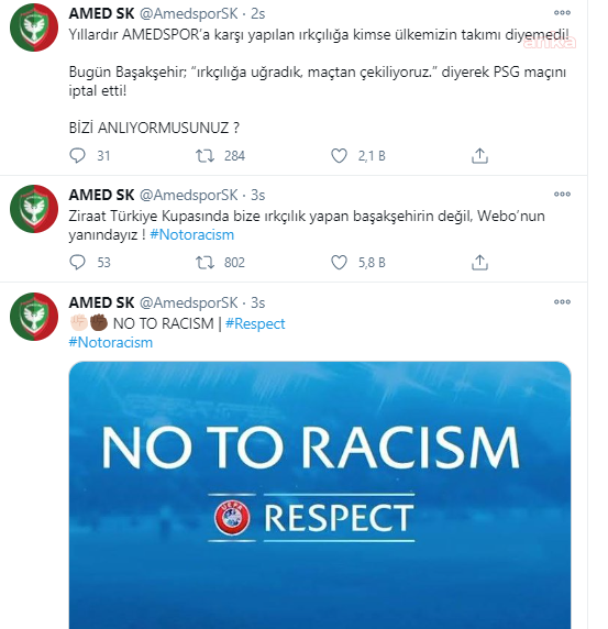 Irkçılığa karşı olduğunu açıklayan Amedspor, “Yıllardır AMEDSPOR’a karşı yapılan ırkçılığa kimse ülkemizin takımı diyemedi! Bugün Başakşehir; ‘ırkçılığa uğradık, maçtan çekiliyoruz’ diyerek PSG maçını iptal etti! BİZİ ANLIYOR MUSUNUZ?” Ziraat Türkiye Kupasında bize ırkçılık yapan Başakşehirin değil, Webo’nun yanındayız ! #Notoracism” paylaşımını yaptı.