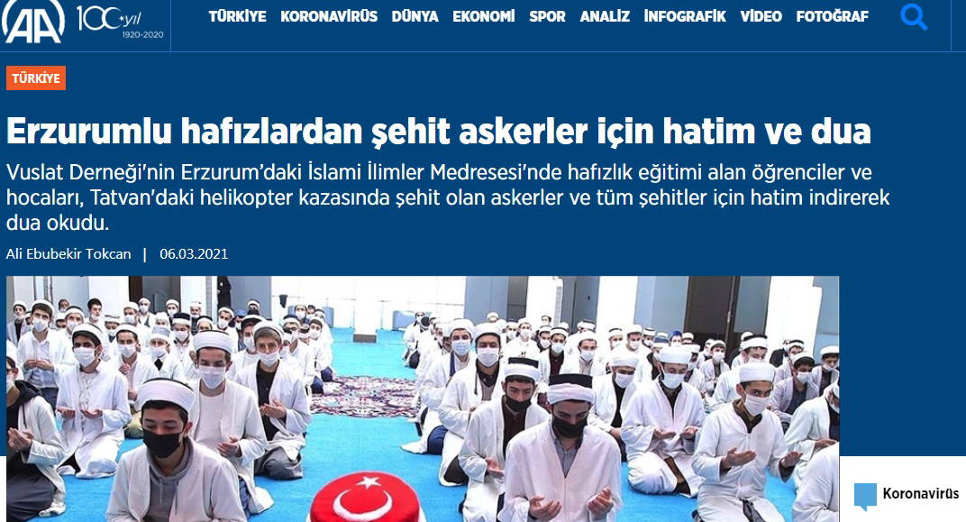 Bu kapsamda derneğin Erzurum’da bulunan ve 'İslami İlimler Medresesi' denilen okulunda "Tatvan'daki helikopter kazasında şehit olan askerler ve tüm şehitler için hatim indirerek dua okuduğu" belirtildi.